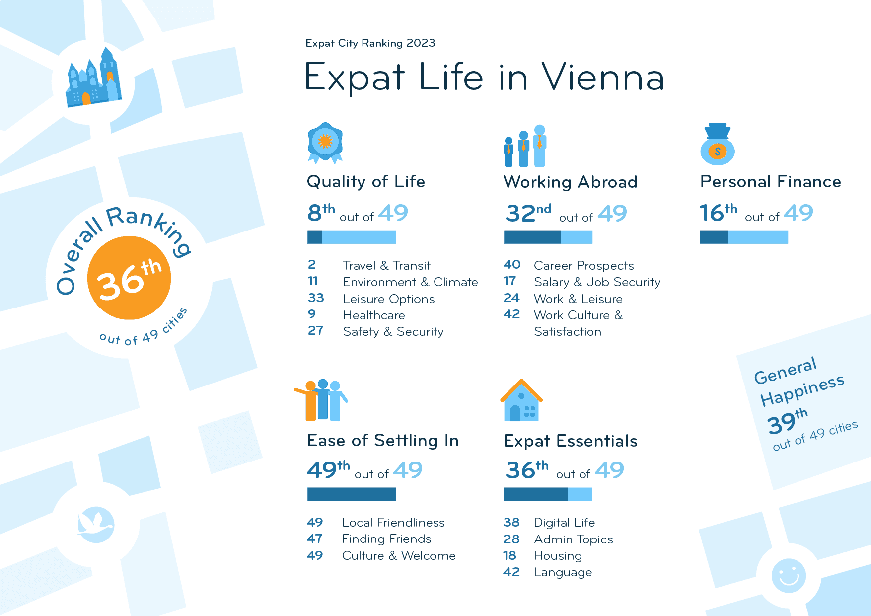 Vienna ranks 36th out of 49 in the Expat City Ranking 2023. It performs worst for Ease of Settling In (49th), where it ranks last. Expats regard the local population as the unfriendliest worldwide (49th) and do not feel welcome (49th). In fact, twice the global average find it difficult to get used to the local culture (36% vs. 18% globally). And a staggering 63% say it’s difficult to make local friends (vs. 36% globally)!