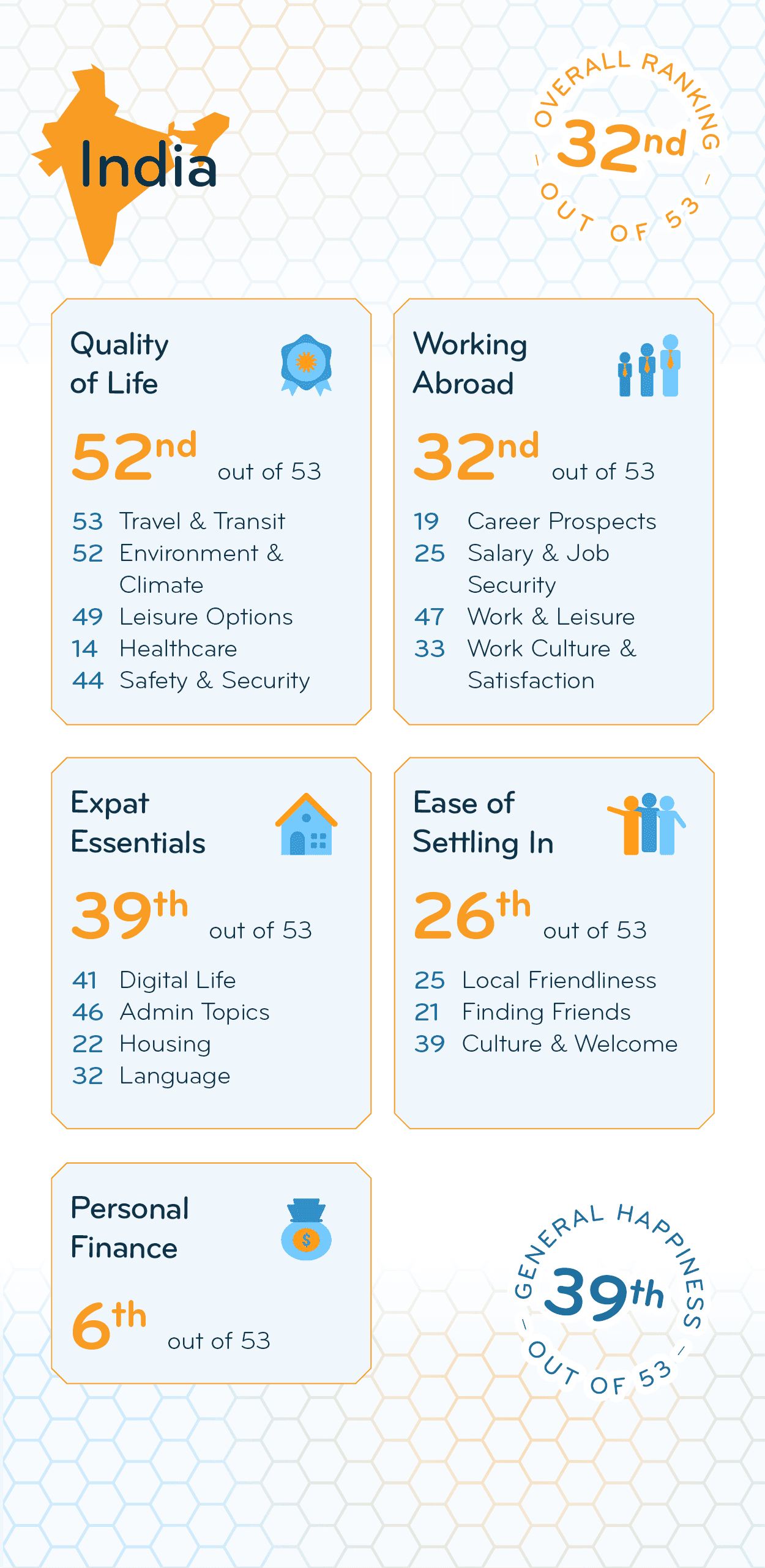 Dealing with local bureaucracy (50th) is often an issue, and online government services aren’t readily available (40th). Factors such as obtaining a visa to move to India (30th) and opening a local bank account (48th) might add to the list of frustrations.